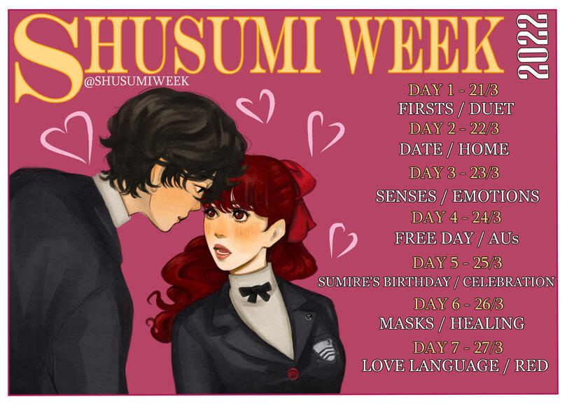 ShuSumi Week is dedicated to celebrating, creating and sharing content about the shipping between Persona 5’s Protagonist Joker and Kasumi Yoshizawa. There will be 7 days of prompts including a free day where creators will produce and post content based on the day’s theme.